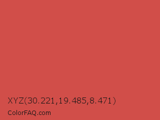 XYZ 30.221,19.485,8.471 Color is a normal red color and the nearest color is English Vermillion #cc474b. Hex code #d14e49 and RGB value is rgb(209,78,73). In RGB color space, this color is composed of 82% red, 31% green, 29% blue, In CMYK color space, this color is composed of 0% cyan, 63% magenta, 65% yellow , 18% black , In HSL color space, this color has a hue angle of 2° , 60% saturation and 55% lightness.