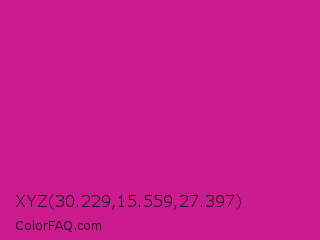 XYZ 30.229,15.559,27.397 Color is a normal magenta color and the nearest color is Red Violet #c71585. Hex code #cc1a8f and RGB value is rgb(204,26,143). In RGB color space, this color is composed of 80% red, 10% green, 56% blue, In CMYK color space, this color is composed of 0% cyan, 87% magenta, 30% yellow , 20% black , In HSL color space, this color has a hue angle of 321° , 77% saturation and 45% lightness.