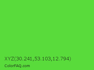 XYZ 30.241,53.103,12.794 Color is a normal green color and the nearest color is Lime Green #32cd32. Hex code #59db3b and RGB value is rgb(89,219,59). In RGB color space, this color is composed of 35% red, 86% green, 23% blue, In CMYK color space, this color is composed of 59% cyan, 0% magenta, 73% yellow , 14% black , In HSL color space, this color has a hue angle of 109° , 69% saturation and 55% lightness.