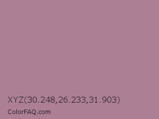 XYZ 30.248,26.233,31.903 Color is a normal rose color and the nearest color is English Lavender #b48395. Hex code #ad7f95 and RGB value is rgb(173,127,149). In RGB color space, this color is composed of 68% red, 50% green, 58% blue, In CMYK color space, this color is composed of 0% cyan, 27% magenta, 14% yellow , 32% black , In HSL color space, this color has a hue angle of 331° , 22% saturation and 59% lightness.