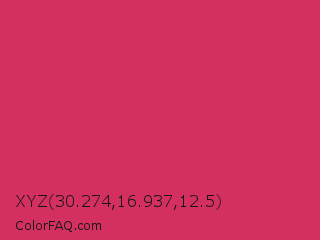 XYZ 30.274,16.937,12.5 Color is a normal rose color and the nearest color is Cerise Red #de3163. Hex code #d4305f and RGB value is rgb(212,48,95). In RGB color space, this color is composed of 83% red, 19% green, 37% blue, In CMYK color space, this color is composed of 0% cyan, 77% magenta, 55% yellow , 17% black , In HSL color space, this color has a hue angle of 343° , 66% saturation and 51% lightness.