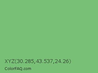 XYZ 30.285,43.537,24.26 Color is a light green color and the nearest color is Iguana Green #71bc78. Hex code #79c177 and RGB value is rgb(121,193,119). In RGB color space, this color is composed of 47% red, 76% green, 47% blue, In CMYK color space, this color is composed of 37% cyan, 0% magenta, 38% yellow , 24% black , In HSL color space, this color has a hue angle of 118° , 37% saturation and 61% lightness.