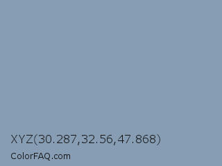 XYZ 30.287,32.56,47.868 Color is a light blue color and the nearest color is Bali Hai #859faf. Hex code #879db4 and RGB value is rgb(135,157,180). In RGB color space, this color is composed of 53% red, 62% green, 71% blue, In CMYK color space, this color is composed of 25% cyan, 13% magenta, 0% yellow , 29% black , In HSL color space, this color has a hue angle of 211° , 23% saturation and 62% lightness.