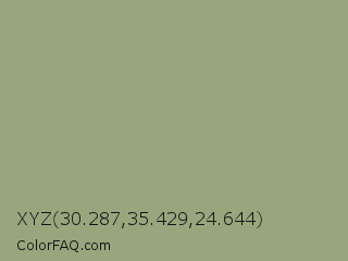 XYZ 30.287,35.429,24.644 Color is a normal green color and the nearest color is Sage #9ea587. Hex code #98a67d and RGB value is rgb(152,166,125). In RGB color space, this color is composed of 60% red, 65% green, 49% blue, In CMYK color space, this color is composed of 8% cyan, 0% magenta, 25% yellow , 35% black , In HSL color space, this color has a hue angle of 80° , 19% saturation and 57% lightness.
