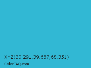 XYZ 30.291,39.687,68.351 Color is a normal cyan color and the nearest color is Scooter #2ebfd4. Hex code #31b8d4 and RGB value is rgb(49,184,212). In RGB color space, this color is composed of 19% red, 72% green, 83% blue, In CMYK color space, this color is composed of 77% cyan, 13% magenta, 0% yellow , 17% black , In HSL color space, this color has a hue angle of 190° , 65% saturation and 51% lightness.