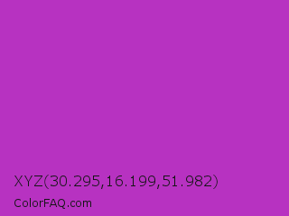 XYZ 30.295,16.199,51.982 Color is a normal magenta color and the nearest color is Steel Pink #cc33cc. Hex code #b732c1 and RGB value is rgb(183,50,193). In RGB color space, this color is composed of 72% red, 20% green, 76% blue, In CMYK color space, this color is composed of 5% cyan, 74% magenta, 0% yellow , 24% black , In HSL color space, this color has a hue angle of 296° , 59% saturation and 48% lightness.