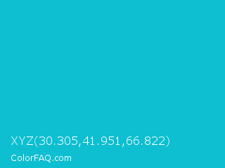 XYZ 30.305,41.951,66.822 Color is a normal cyan color and the nearest color is Turquoise Surf #00c5cd. Hex code #0dbfd1 and RGB value is rgb(13,191,209). In RGB color space, this color is composed of 5% red, 75% green, 82% blue, In CMYK color space, this color is composed of 94% cyan, 9% magenta, 0% yellow , 18% black , In HSL color space, this color has a hue angle of 186° , 88% saturation and 44% lightness.