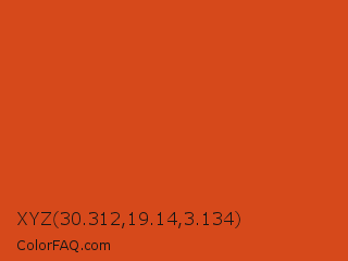 XYZ 30.312,19.14,3.134 Color is a normal color and the nearest color is Vermilion #d9381e. Hex code #d6491b and RGB value is rgb(214,73,27). In RGB color space, this color is composed of 84% red, 29% green, 11% blue, In CMYK color space, this color is composed of 0% cyan, 66% magenta, 87% yellow , 16% black , In HSL color space, this color has a hue angle of 15° , 78% saturation and 47% lightness.