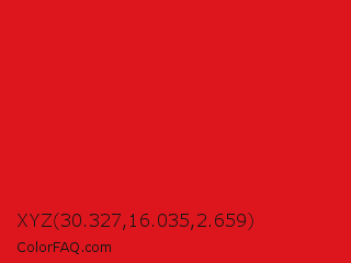 XYZ 30.327,16.035,2.659 Color is a normal red color and the nearest color is Maximum Red #d92121. Hex code #dd161d and RGB value is rgb(221,22,29). In RGB color space, this color is composed of 87% red, 9% green, 11% blue, In CMYK color space, this color is composed of 0% cyan, 90% magenta, 87% yellow , 13% black , In HSL color space, this color has a hue angle of 358° , 82% saturation and 48% lightness.