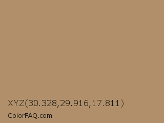 XYZ 30.328,29.916,17.811 Color is a normal orange color and the nearest color is Light Taupe #b38b6d. Hex code #b08f6a and RGB value is rgb(176,143,106). In RGB color space, this color is composed of 69% red, 56% green, 42% blue, In CMYK color space, this color is composed of 0% cyan, 19% magenta, 40% yellow , 31% black , In HSL color space, this color has a hue angle of 32° , 31% saturation and 55% lightness.