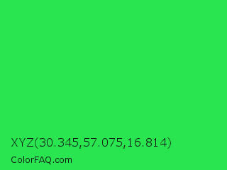 XYZ 30.345,57.075,16.814 Color is a normal green color and the nearest color is Malachite #0bda51. Hex code #29e54f and RGB value is rgb(41,229,79). In RGB color space, this color is composed of 16% red, 90% green, 31% blue, In CMYK color space, this color is composed of 82% cyan, 0% magenta, 66% yellow , 10% black , In HSL color space, this color has a hue angle of 132° , 78% saturation and 53% lightness.