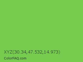 XYZ 30.34,47.532,14.973 Color is a normal green color and the nearest color is Mantis #74c365. Hex code #75cc4f and RGB value is rgb(117,204,79). In RGB color space, this color is composed of 46% red, 80% green, 31% blue, In CMYK color space, this color is composed of 43% cyan, 0% magenta, 61% yellow , 20% black , In HSL color space, this color has a hue angle of 102° , 55% saturation and 55% lightness.