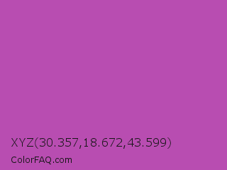 XYZ 30.357,18.672,43.599 Color is a normal magenta color and the nearest color is Fuchsia Pink #c154c1. Hex code #b84db1 and RGB value is rgb(184,77,177). In RGB color space, this color is composed of 72% red, 30% green, 69% blue, In CMYK color space, this color is composed of 0% cyan, 58% magenta, 4% yellow , 28% black , In HSL color space, this color has a hue angle of 304° , 43% saturation and 51% lightness.