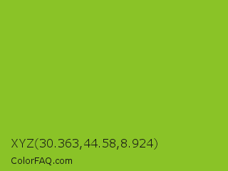 XYZ 30.363,44.58,8.924 Color is a normal green color and the nearest color is Atlantis #97cd2d. Hex code #8ac327 and RGB value is rgb(138,195,39). In RGB color space, this color is composed of 54% red, 76% green, 15% blue, In CMYK color space, this color is composed of 29% cyan, 0% magenta, 80% yellow , 24% black , In HSL color space, this color has a hue angle of 82° , 67% saturation and 46% lightness.