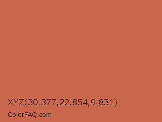 XYZ 30.377,22.854,9.831 Color is a normal red color and the nearest color is Copper Red #cb6d51. Hex code #c9684d and RGB value is rgb(201,104,77). In RGB color space, this color is composed of 79% red, 41% green, 30% blue, In CMYK color space, this color is composed of 0% cyan, 48% magenta, 62% yellow , 21% black , In HSL color space, this color has a hue angle of 13° , 53% saturation and 55% lightness.
