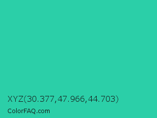 XYZ 30.377,47.966,44.703 Color is a normal cyan color and the nearest color is Shamrock #33cc99. Hex code #2bcfa8 and RGB value is rgb(43,207,168). In RGB color space, this color is composed of 17% red, 81% green, 66% blue, In CMYK color space, this color is composed of 79% cyan, 0% magenta, 19% yellow , 19% black , In HSL color space, this color has a hue angle of 166° , 66% saturation and 49% lightness.