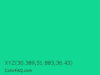XYZ 30.389,51.883,36.43 Color is a normal green color and the nearest color is Caribbean Green #00cc99. Hex code #11d994 and RGB value is rgb(17,217,148). In RGB color space, this color is composed of 7% red, 85% green, 58% blue, In CMYK color space, this color is composed of 92% cyan, 0% magenta, 32% yellow , 15% black , In HSL color space, this color has a hue angle of 159° , 85% saturation and 46% lightness.