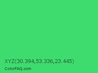 XYZ 30.394,53.336,23.445 Color is a normal green color and the nearest color is UFO Green #3cd070. Hex code #3edc6e and RGB value is rgb(62,220,110). In RGB color space, this color is composed of 24% red, 86% green, 43% blue, In CMYK color space, this color is composed of 72% cyan, 0% magenta, 50% yellow , 14% black , In HSL color space, this color has a hue angle of 138° , 69% saturation and 55% lightness.