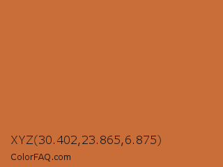 XYZ 30.402,23.865,6.875 Color is a normal orange color and the nearest color is Copper #b87333. Hex code #c96e39 and RGB value is rgb(201,110,57). In RGB color space, this color is composed of 79% red, 43% green, 22% blue, In CMYK color space, this color is composed of 0% cyan, 45% magenta, 72% yellow , 21% black , In HSL color space, this color has a hue angle of 22° , 57% saturation and 51% lightness.