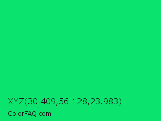 XYZ 30.409,56.128,23.983 Color is a normal green color and the nearest color is Malachite #0bda51. Hex code #0ae36e and RGB value is rgb(10,227,110). In RGB color space, this color is composed of 4% red, 89% green, 43% blue, In CMYK color space, this color is composed of 96% cyan, 0% magenta, 52% yellow , 11% black , In HSL color space, this color has a hue angle of 148° , 92% saturation and 46% lightness.