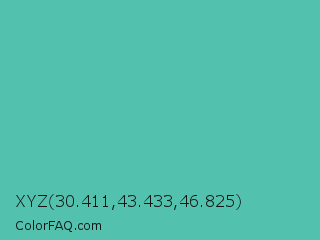 XYZ 30.411,43.433,46.825 Color is a normal cyan color and the nearest color is Puerto Rico #3fc1aa. Hex code #52c2ae and RGB value is rgb(82,194,174). In RGB color space, this color is composed of 32% red, 76% green, 68% blue, In CMYK color space, this color is composed of 58% cyan, 0% magenta, 10% yellow , 24% black , In HSL color space, this color has a hue angle of 169° , 48% saturation and 54% lightness.