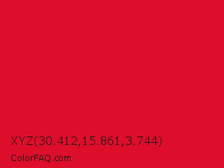 XYZ 30.412,15.861,3.744 Color is a normal red color and the nearest color is Medium Candy Apple Red #e2062c. Hex code #dd0e2b and RGB value is rgb(221,14,43). In RGB color space, this color is composed of 87% red, 5% green, 17% blue, In CMYK color space, this color is composed of 0% cyan, 94% magenta, 81% yellow , 13% black , In HSL color space, this color has a hue angle of 352° , 88% saturation and 46% lightness.