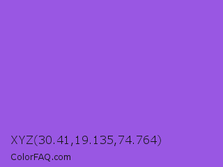 XYZ 30.41,19.135,74.764 Color is a light violet color and the nearest color is Navy Purple #9457eb. Hex code #9957e3 and RGB value is rgb(153,87,227). In RGB color space, this color is composed of 60% red, 34% green, 89% blue, In CMYK color space, this color is composed of 33% cyan, 62% magenta, 0% yellow , 11% black , In HSL color space, this color has a hue angle of 268° , 71% saturation and 62% lightness.