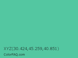 XYZ 30.424,45.259,40.851 Color is a normal green color and the nearest color is Ocean Green #48bf91. Hex code #53c7a1 and RGB value is rgb(83,199,161). In RGB color space, this color is composed of 33% red, 78% green, 63% blue, In CMYK color space, this color is composed of 58% cyan, 0% magenta, 19% yellow , 22% black , In HSL color space, this color has a hue angle of 160° , 51% saturation and 55% lightness.