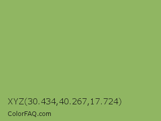 XYZ 30.434,40.267,17.724 Color is a normal green color and the nearest color is Dollar Bill #85bb65. Hex code #90b662 and RGB value is rgb(144,182,98). In RGB color space, this color is composed of 56% red, 71% green, 38% blue, In CMYK color space, this color is composed of 21% cyan, 0% magenta, 46% yellow , 29% black , In HSL color space, this color has a hue angle of 87° , 37% saturation and 55% lightness.