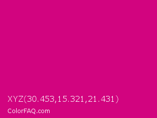 XYZ 30.453,15.321,21.431 Color is a normal magenta color and the nearest color is Mexican Pink #e4007c. Hex code #d2047f and RGB value is rgb(210,4,127). In RGB color space, this color is composed of 82% red, 2% green, 50% blue, In CMYK color space, this color is composed of 0% cyan, 98% magenta, 40% yellow , 18% black , In HSL color space, this color has a hue angle of 324° , 96% saturation and 42% lightness.