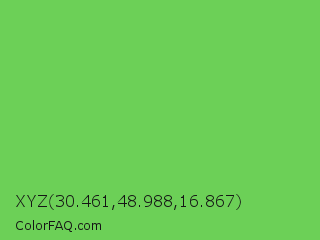 XYZ 30.461,48.988,16.867 Color is a normal green color and the nearest color is Mantis #74c365. Hex code #6cd057 and RGB value is rgb(108,208,87). In RGB color space, this color is composed of 42% red, 82% green, 34% blue, In CMYK color space, this color is composed of 48% cyan, 0% magenta, 58% yellow , 18% black , In HSL color space, this color has a hue angle of 110° , 56% saturation and 58% lightness.