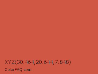 XYZ 30.464,20.644,7.848 Color is a normal red color and the nearest color is Dark Coral #cd5b45. Hex code #d05744 and RGB value is rgb(208,87,68). In RGB color space, this color is composed of 82% red, 34% green, 27% blue, In CMYK color space, this color is composed of 0% cyan, 58% magenta, 67% yellow , 18% black , In HSL color space, this color has a hue angle of 8° , 60% saturation and 54% lightness.