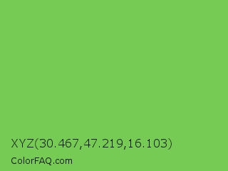 XYZ 30.467,47.219,16.103 Color is a normal green color and the nearest color is Mantis #74c365. Hex code #76cb55 and RGB value is rgb(118,203,85). In RGB color space, this color is composed of 46% red, 80% green, 33% blue, In CMYK color space, this color is composed of 42% cyan, 0% magenta, 58% yellow , 20% black , In HSL color space, this color has a hue angle of 103° , 53% saturation and 56% lightness.
