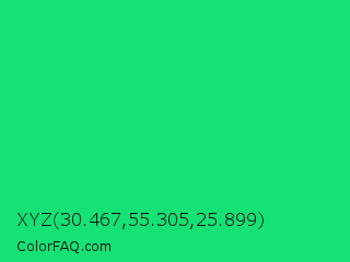 XYZ 30.467,55.305,25.899 Color is a normal green color and the nearest color is Malachite #0bda51. Hex code #16e175 and RGB value is rgb(22,225,117). In RGB color space, this color is composed of 9% red, 88% green, 46% blue, In CMYK color space, this color is composed of 90% cyan, 0% magenta, 48% yellow , 12% black , In HSL color space, this color has a hue angle of 148° , 82% saturation and 48% lightness.