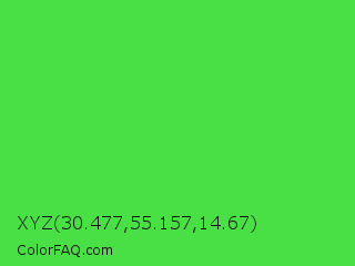 XYZ 30.477,55.157,14.67 Color is a normal green color and the nearest color is Lime Green #32cd32. Hex code #49e045 and RGB value is rgb(73,224,69). In RGB color space, this color is composed of 29% red, 88% green, 27% blue, In CMYK color space, this color is composed of 67% cyan, 0% magenta, 69% yellow , 12% black , In HSL color space, this color has a hue angle of 118° , 71% saturation and 57% lightness.