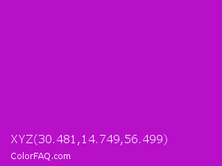 XYZ 30.481,14.749,56.499 Color is a normal magenta color and the nearest color is Heliotrope Magenta #aa00bb. Hex code #b80fc9 and RGB value is rgb(184,15,201). In RGB color space, this color is composed of 72% red, 6% green, 79% blue, In CMYK color space, this color is composed of 8% cyan, 93% magenta, 0% yellow , 21% black , In HSL color space, this color has a hue angle of 295° , 86% saturation and 42% lightness.