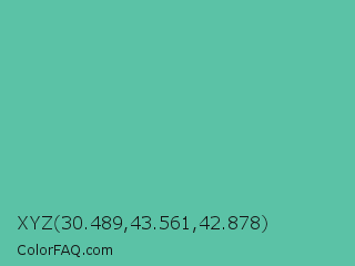 XYZ 30.489,43.561,42.878 Color is a normal cyan color and the nearest color is Tradewind #5fb3ac. Hex code #5bc2a6 and RGB value is rgb(91,194,166). In RGB color space, this color is composed of 36% red, 76% green, 65% blue, In CMYK color space, this color is composed of 53% cyan, 0% magenta, 14% yellow , 24% black , In HSL color space, this color has a hue angle of 164° , 46% saturation and 56% lightness.