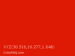 XYZ 30.516,16.277,1.648 Color is a normal red color and the nearest color is Rosso Corsa #d40000. Hex code #de1a04 and RGB value is rgb(222,26,4). In RGB color space, this color is composed of 87% red, 10% green, 2% blue, In CMYK color space, this color is composed of 0% cyan, 88% magenta, 98% yellow , 13% black , In HSL color space, this color has a hue angle of 6° , 96% saturation and 44% lightness.