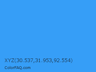 XYZ 30.537,31.953,92.554 Color is a normal blue color and the nearest color is Brilliant Azure #3399ff. Hex code #369ef7 and RGB value is rgb(54,158,247). In RGB color space, this color is composed of 21% red, 62% green, 97% blue, In CMYK color space, this color is composed of 78% cyan, 36% magenta, 0% yellow , 3% black , In HSL color space, this color has a hue angle of 208° , 92% saturation and 59% lightness.