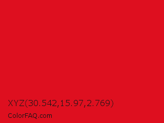 XYZ 30.542,15.97,2.769 Color is a normal red color and the nearest color is Lava #cf1020. Hex code #de0f1f and RGB value is rgb(222,15,31). In RGB color space, this color is composed of 87% red, 6% green, 12% blue, In CMYK color space, this color is composed of 0% cyan, 93% magenta, 86% yellow , 13% black , In HSL color space, this color has a hue angle of 355° , 87% saturation and 46% lightness.