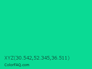 XYZ 30.542,52.345,36.511 Color is a normal green color and the nearest color is Caribbean Green #00cc99. Hex code #0ada94 and RGB value is rgb(10,218,148). In RGB color space, this color is composed of 4% red, 85% green, 58% blue, In CMYK color space, this color is composed of 95% cyan, 0% magenta, 32% yellow , 15% black , In HSL color space, this color has a hue angle of 160° , 91% saturation and 45% lightness.