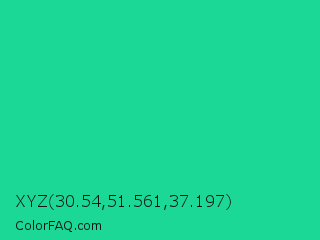 XYZ 30.54,51.561,37.197 Color is a normal green color and the nearest color is Shamrock #33cc99. Hex code #1cd896 and RGB value is rgb(28,216,150). In RGB color space, this color is composed of 11% red, 85% green, 59% blue, In CMYK color space, this color is composed of 87% cyan, 0% magenta, 31% yellow , 15% black , In HSL color space, this color has a hue angle of 159° , 77% saturation and 48% lightness.