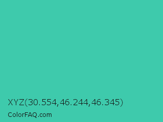 XYZ 30.554,46.244,46.345 Color is a normal cyan color and the nearest color is Puerto Rico #3fc1aa. Hex code #3ecaac and RGB value is rgb(62,202,172). In RGB color space, this color is composed of 24% red, 79% green, 67% blue, In CMYK color space, this color is composed of 69% cyan, 0% magenta, 15% yellow , 21% black , In HSL color space, this color has a hue angle of 167° , 57% saturation and 52% lightness.