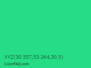 XYZ 30.557,53.264,30.5 Color is a normal green color and the nearest color is Shamrock #33cc99. Hex code #26dc84 and RGB value is rgb(38,220,132). In RGB color space, this color is composed of 15% red, 86% green, 52% blue, In CMYK color space, this color is composed of 83% cyan, 0% magenta, 40% yellow , 14% black , In HSL color space, this color has a hue angle of 151° , 72% saturation and 51% lightness.
