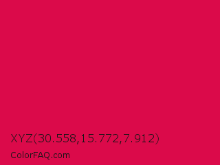 XYZ 30.558,15.772,7.912 Color is a normal rose color and the nearest color is Debian Red #d70a53. Hex code #db0a4a and RGB value is rgb(219,10,74). In RGB color space, this color is composed of 86% red, 4% green, 29% blue, In CMYK color space, this color is composed of 0% cyan, 95% magenta, 66% yellow , 14% black , In HSL color space, this color has a hue angle of 342° , 91% saturation and 45% lightness.