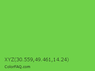 XYZ 30.559,49.461,14.24 Color is a normal green color and the nearest color is Mantis #74c365. Hex code #6fd149 and RGB value is rgb(111,209,73). In RGB color space, this color is composed of 44% red, 82% green, 29% blue, In CMYK color space, this color is composed of 47% cyan, 0% magenta, 65% yellow , 18% black , In HSL color space, this color has a hue angle of 103° , 60% saturation and 55% lightness.