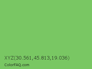 XYZ 30.561,45.813,19.036 Color is a normal green color and the nearest color is Mantis #74c365. Hex code #79c763 and RGB value is rgb(121,199,99). In RGB color space, this color is composed of 47% red, 78% green, 39% blue, In CMYK color space, this color is composed of 39% cyan, 0% magenta, 50% yellow , 22% black , In HSL color space, this color has a hue angle of 107° , 47% saturation and 58% lightness.