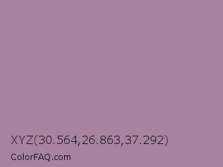 XYZ 30.564,26.863,37.292 Color is a normal magenta color and the nearest color is Bouquet #ae809e. Hex code #a882a1 and RGB value is rgb(168,130,161). In RGB color space, this color is composed of 66% red, 51% green, 63% blue, In CMYK color space, this color is composed of 0% cyan, 23% magenta, 4% yellow , 34% black , In HSL color space, this color has a hue angle of 311° , 18% saturation and 58% lightness.