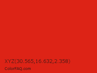XYZ 30.565,16.632,2.358 Color is a normal red color and the nearest color is Maximum Red #d92121. Hex code #dd2316 and RGB value is rgb(221,35,22). In RGB color space, this color is composed of 87% red, 14% green, 9% blue, In CMYK color space, this color is composed of 0% cyan, 84% magenta, 90% yellow , 13% black , In HSL color space, this color has a hue angle of 4° , 82% saturation and 48% lightness.