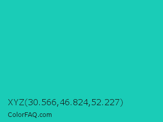 XYZ 30.566,46.824,52.227 Color is a normal cyan color and the nearest color is Java #1fc2c2. Hex code #1accb7 and RGB value is rgb(26,204,183). In RGB color space, this color is composed of 10% red, 80% green, 72% blue, In CMYK color space, this color is composed of 87% cyan, 0% magenta, 10% yellow , 20% black , In HSL color space, this color has a hue angle of 173° , 77% saturation and 45% lightness.